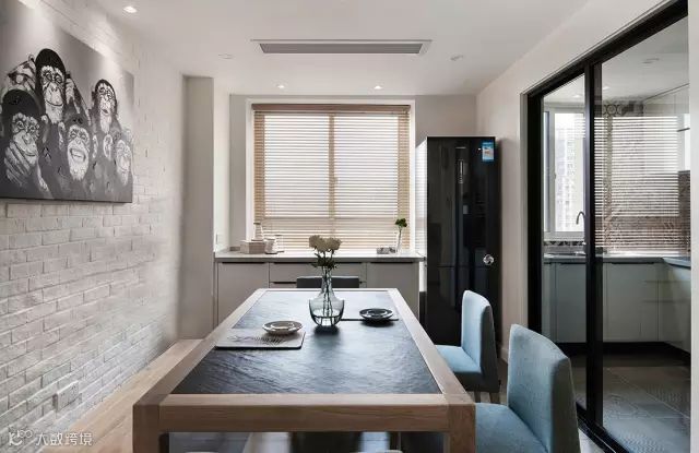 ➫餐厅的墙壁与客厅电视墙相辉映,体现整体的统一,一张餐桌一条长凳,两把软椅,这样的结合打破传统的一桌四椅,显得不那么生硬。