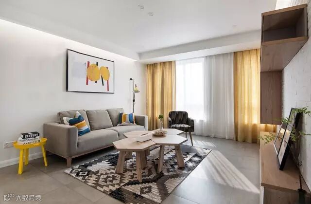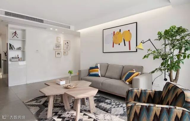 ➫客厅的茶几用不规则的多边形拼接,增加了空间的灵动性,可以试想一下一个方正的茶几放在这个位置实现么效果。