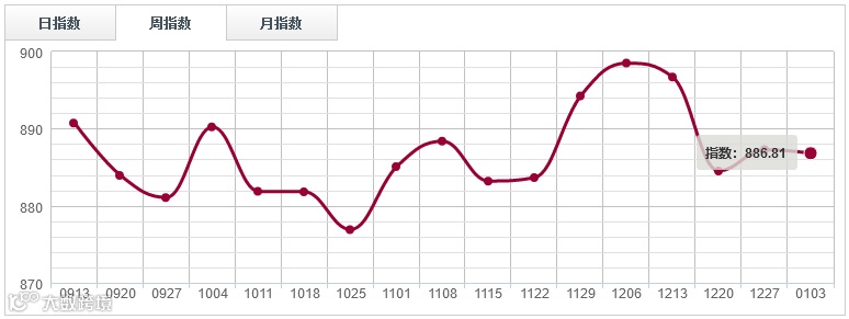本周人造板分类指数微幅下跌,报收886.81点,环比下跌0.05%。其中鱼珠人造板指数上涨0.29%、福人人造板指数上涨0.35%;大西南人造板指数下跌0.72%、临沂人造板指数拉升0.1%。