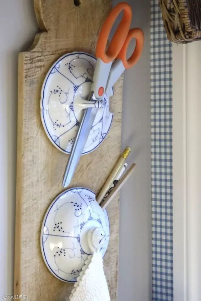 不小心摔破了盘子吗?只要确认盘子本身不会有危险性,那么你可以试试将这些缺口拿来当放剪刀或是吊抹布的小机关。