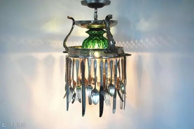 将刀叉与汤匙变成吊灯上的水晶,透过铁餐具的光线反射,制造出很棒的室内灯光效果。