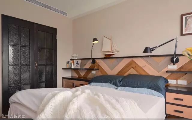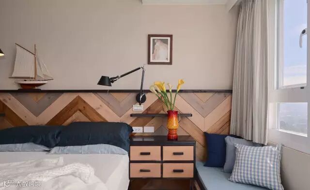 卧室中木贴面墙壁整齐的排列让空间富有节奏感,不同的颜色则为房主营造出温馨的气氛。
