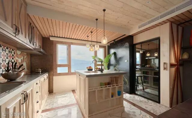 开放式的厨房和餐厅的过渡十分自然,人们可以通过不同材质的地板将两个空间区分。