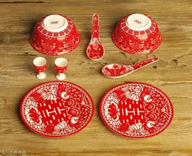 这是典型的中式喜宴中的餐具,酒杯、喜碗、喜碟和汤匙一应俱全。