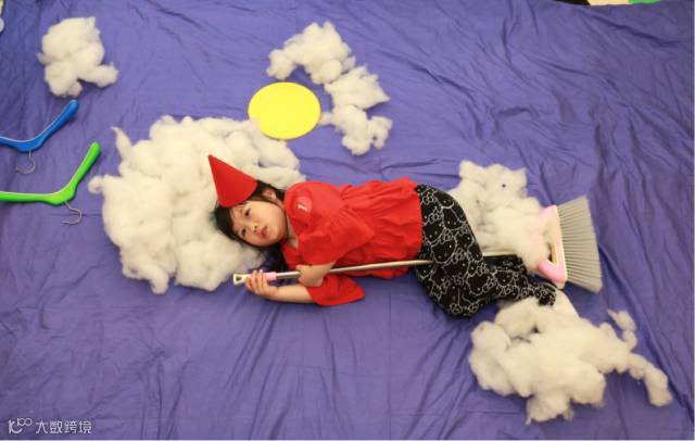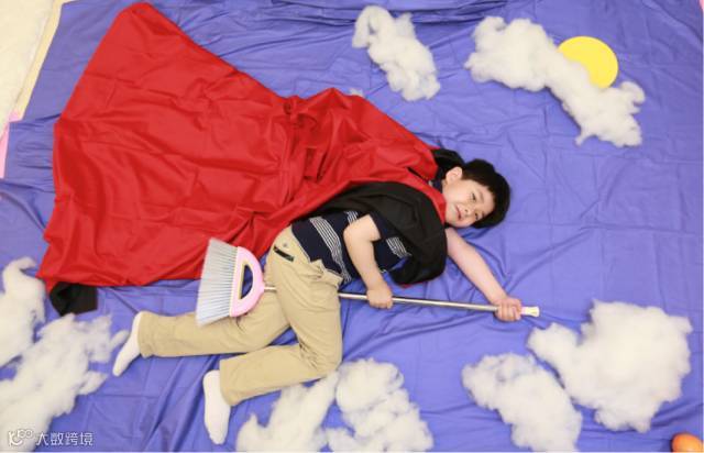 比如让孩子躺在彩色床单上,用棉花和衣架、扫帚等等日用品做小道具,父母从高处俯拍,就能拍出宝宝变身小飞侠、小超人、小魔女的创意照片。