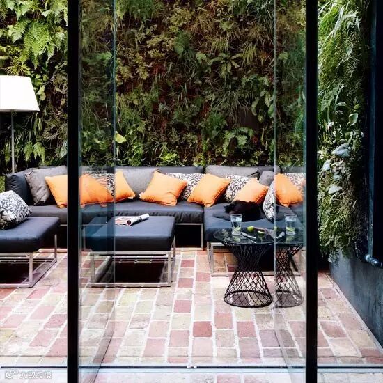 如果你有一个露台那可就更美啦,一定要好好利用起来!种满绿植的背景墙搭配上深蓝色的沙发、橘色的抱枕,享受春天就在自家的露台实现啦!