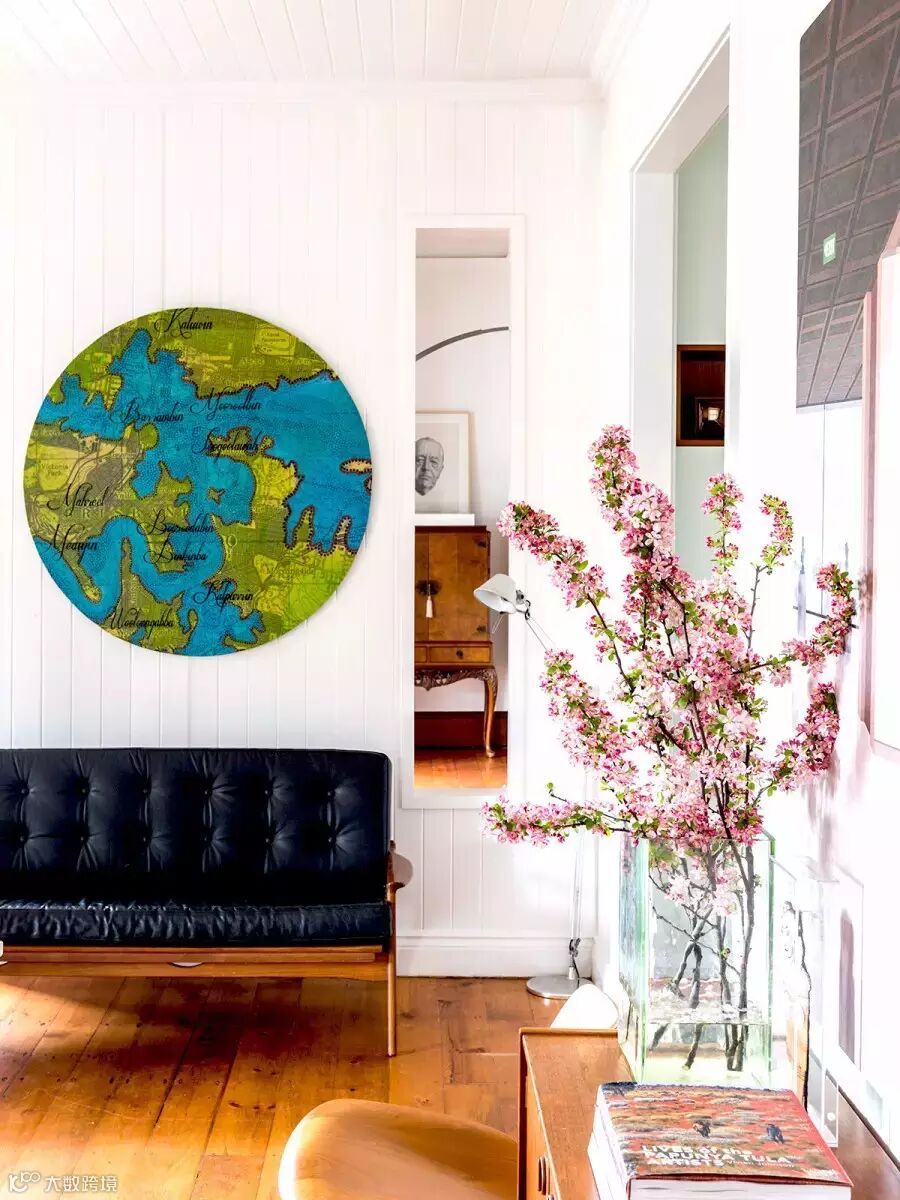 除了绿色的树,粉色的花儿也开了呀,在墙边的五斗柜上摆上一个花瓶,心情立刻好起来。沙发背景墙上的地球挂饰,将人与自然结合起来,让室内充满了生机。