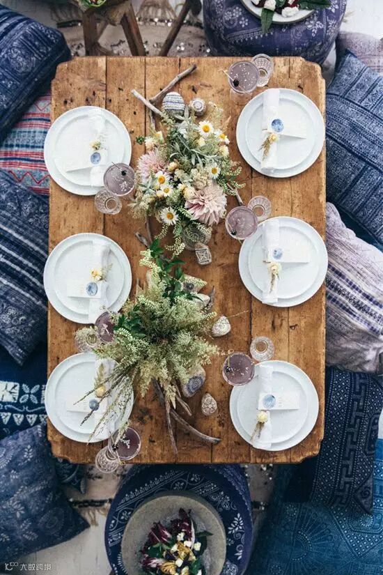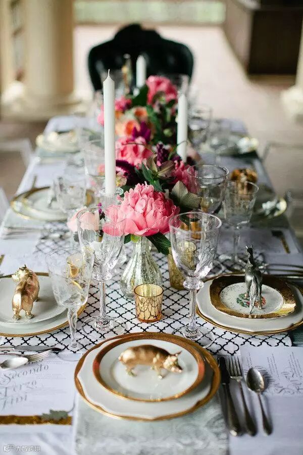 餐桌花艺不宜太高,不要超过对座客人的视线。圆形的餐桌,可以正中摆入一组,也可以以餐桌为中心,三角形摆放小组花艺;长方形的大餐桌,则可以水平方向摆放花艺。