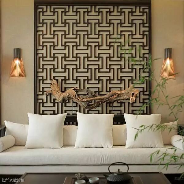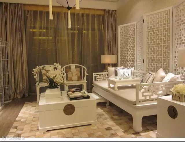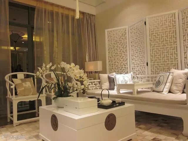 经典中式客厅装修效果图,白色镂空屏风和实木坐榻完美展示中式装修独特风采。