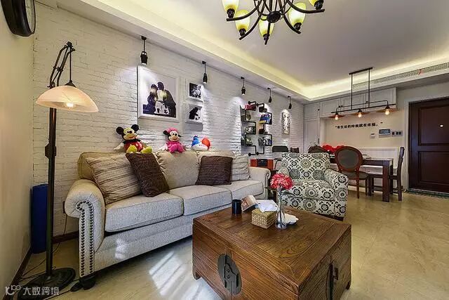 客厅装修效果图,简单温馨,布艺沙发舒适简单,木质箱子作为茶几设计富有新意,温馨的落地灯增加客厅灯源,样式和造型有点复古,增加客厅装修的历史感和艺术气息。