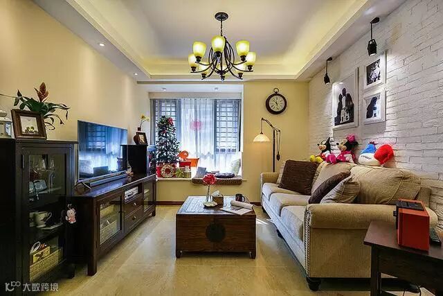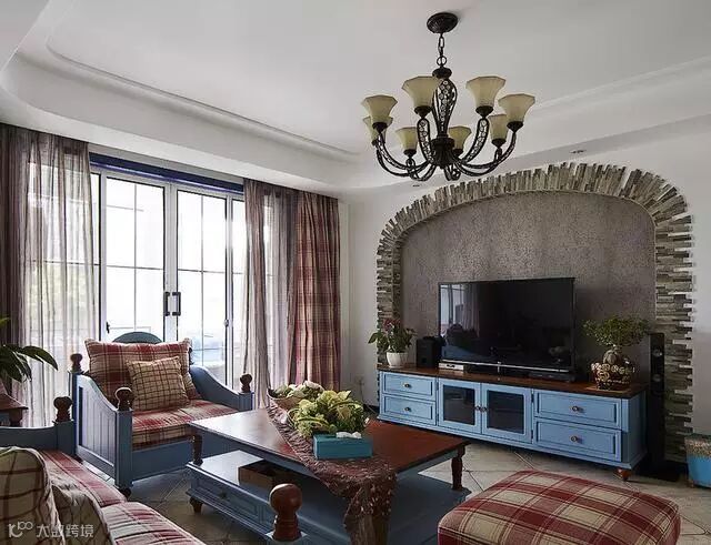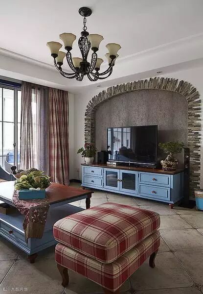 地中海风格中式装修效果图,电视背景墙采用的是拱形造型,外部边框采用的是青砖样式堆叠,历史感十足,异域风情十足。