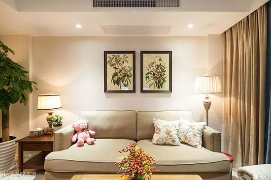 沙发旁的一只小边桌提供更为方便的使用功能,两侧台灯与落地灯用于补充小范围的区域照明,沙发背景墙挂了两幅花草装饰画,有着清新的自然感觉。