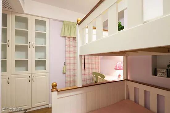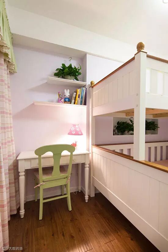 次卧也是儿童房,书桌上方的两块搁板用以简单的收纳,显得干净清爽。上下铺的双层床更是节省空间的选择。