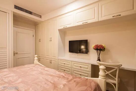 主卧室空间以典型的田园风格来打造,白色的空间主色调与白色的家居构成淡雅的空间色调,配上深色的木地板,呈现出素雅的乡村田园气息。