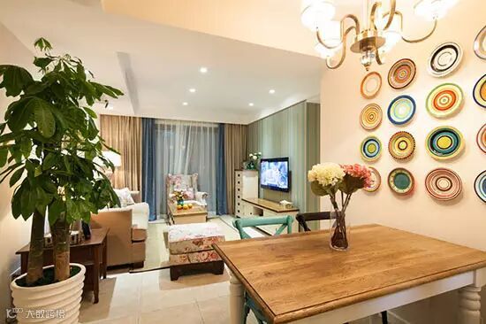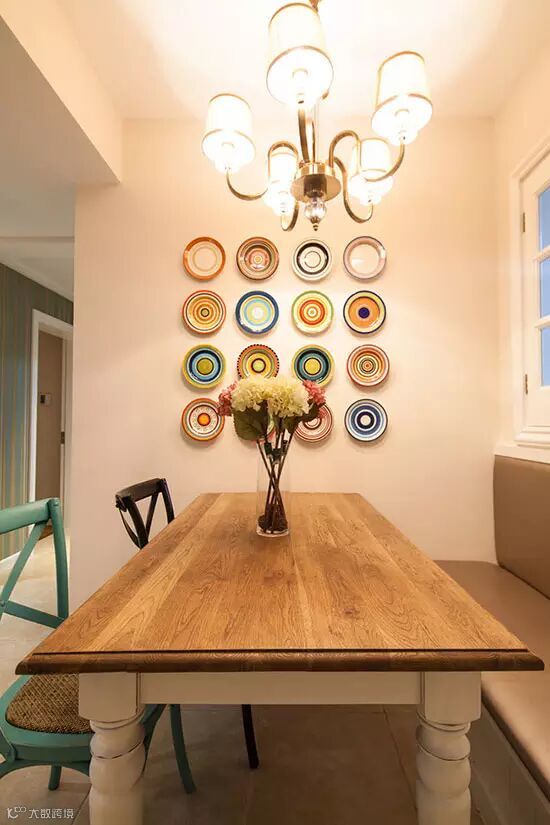 木质餐桌有着美式的纯朴自然气质,两只不同颜色的餐椅简单而朴素,颇有乡村情怀。餐厅背景墙用十六只色彩图案各异的艺术盘来排布装饰,让空间更具活力。