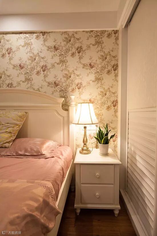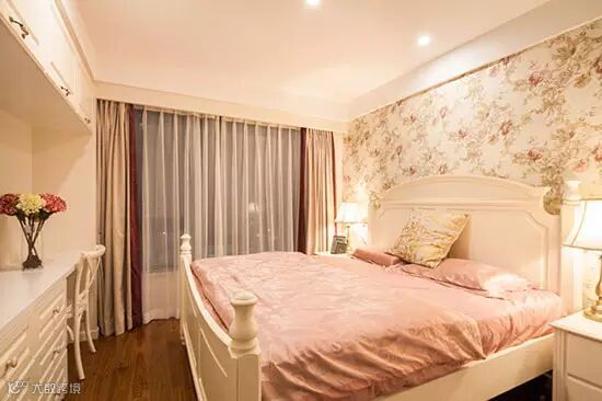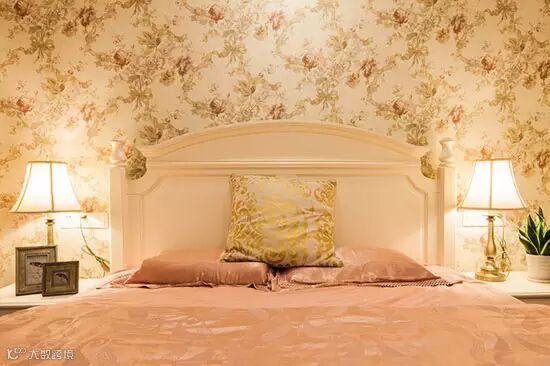 床头背景墙以碎花壁纸来装饰,精致唯美。双人床两侧的床头柜与台灯对称摆放,显出典雅的对称美感。