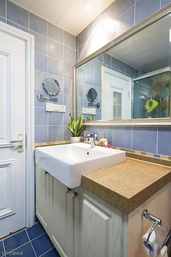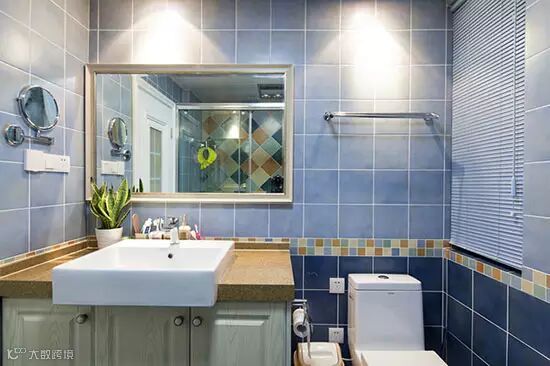 卫浴间以蓝色为主色调,上下以偏浅和偏深的两种色调来营造空间层次感,中间用彩色马赛克腰线来划分。