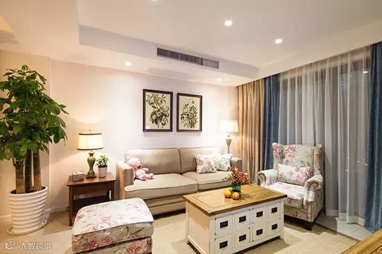 浅色调非常适合面积不大的小空间,白墙搭配米色地砖,让客厅空间有了淡雅的基调。纯色的双人沙发与碎花单人沙发搭配,尤为活泼闲适。
