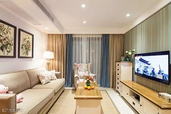 窗帘选用黄色与蓝色拼接的款式,冷暖结合的色调让空间色彩得以平衡。电视背景墙选用竖条纹壁纸,土黄色和浅绿色的搭配呈现出美式乡村的质朴气息。