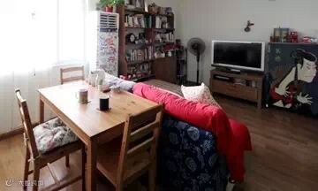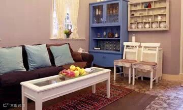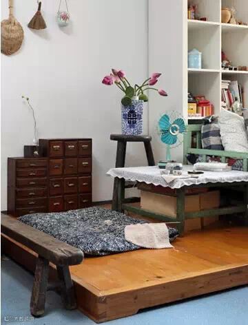 几个粗布蓝印花坐垫都是丁子自己做的,为这个空间增加不少主次分明的主色调