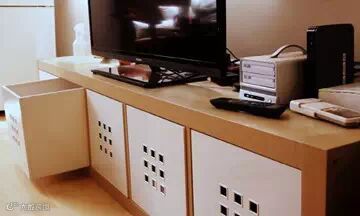 将储物柜改造成电视柜,原来的储物柜子一共有五个“洞”,每个都可以在宜家配到抽屉,配套的买下来组装一下就变成超级大容量的“电视柜”了。