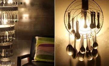 两盏很有意思的勺灯,用日本不锈钢的勺子加上香港小吃摊常见的“捞沥”加上节能灯泡焊做,开灯以后,垂挂的勺子层层推进围成从大到小的圆圈,发出美丽银光。
