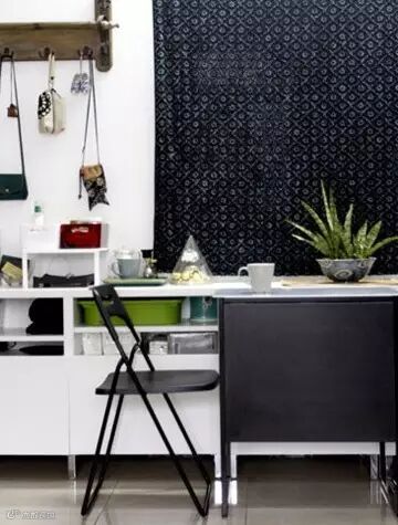 因为是老式的房屋,厨房和客厅相连,墙上方安有小窗户,不大美观,阿米用扎染黑麻布缝制了一个帘子,巧妙地将窗户隐藏起来,搭配小饰物和餐边柜,营造餐厅的视觉重心。