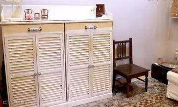 两个双门鞋柜组合成一个大鞋柜,将旧衣帽架的一块木板拿出来粘贴在上方,刷上做旧的白漆,在鞋柜上展示旅行带回来的旧物。