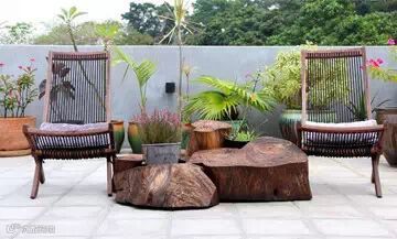村里砍伐丢弃的旧木桩被Debi捡回来,重新刷漆,摆上盆栽,挨两张藤椅,变成家中的自然装饰。