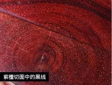紫檀原木表面,由于水分流失开裂,导致氧化变黑而形成黑线。