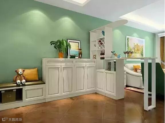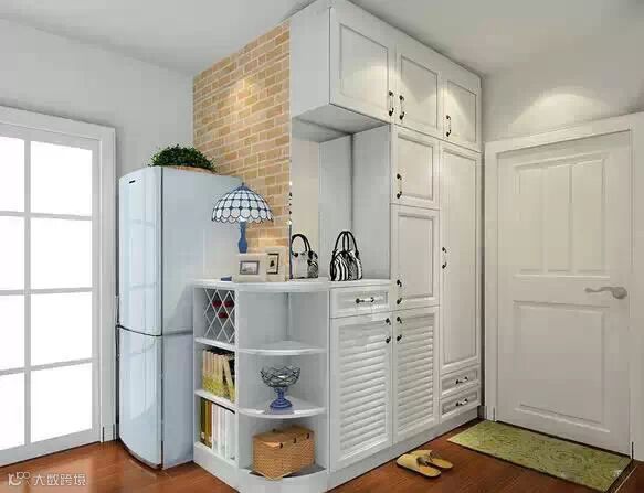 柜子+镂空屏风的组合,巧妙隔开空间,美美地把杂物收了。