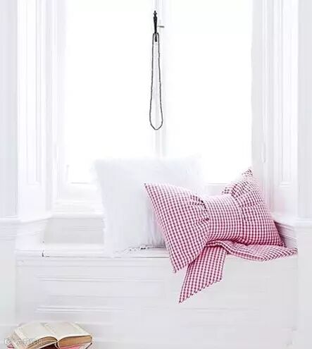 ▲ 整个空间呈现白色,同样是在窗户下方的位置特意留出了一个小坐台的空间,小飘窗就这样打造出来了。点缀其间的粉色条纹抱枕让这个角落瞬间变得可爱起来。