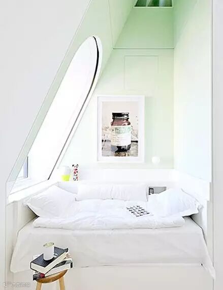 ▲阁楼中又得天独厚的位置优势,斜顶下方的地方总有利用不到的,所以飘窗就成了最好的选择。打造一个宽度和高度都适中的地台,上方放上软垫就成了,侧面就是阁楼的天窗,有很不错的视野啊!