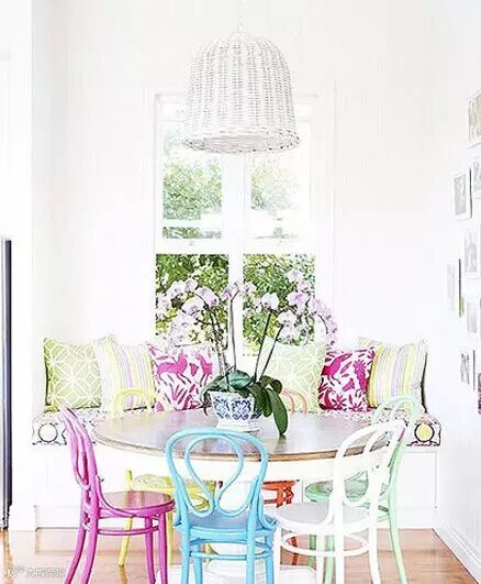▲其实飘窗也可以当成餐厅使用,只要在前方放上适合的餐桌,周围再放上一两张椅子,就是一家人可以吃饭的不错空间了。整个空间色彩充满活力,和窗外的风景相呼应。