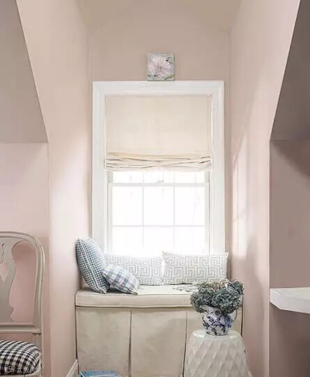 ▲ 粉色墙体,将整个空间都调和成温柔浪漫的气质,阁楼样式的空间中,两面墙体中间空出了一小块内嵌样式的角落,因为有了窗户的点缀所以这个空间自然而然的就设计成飘窗了,无论是其上抱枕的样式、颜色还是下方软垫以及植物的选择都很好的符合整体风格。