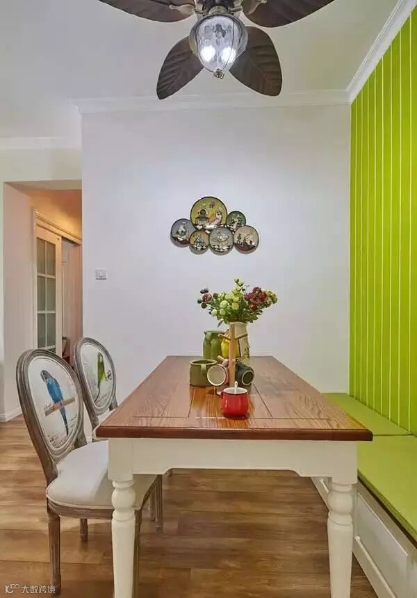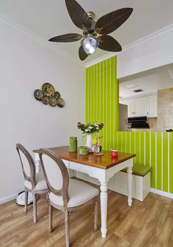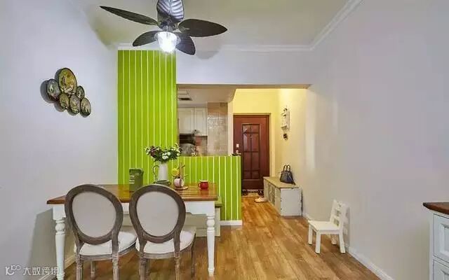 进门之后是半开放式的厨房,和餐厅之间用一堵亮绿色的石膏板隔断。