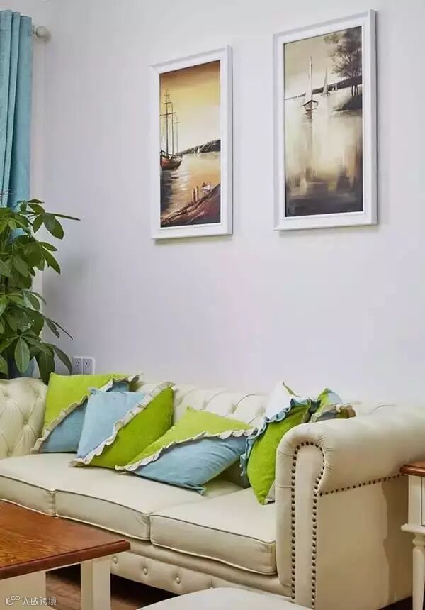 皮沙发配上几个蓝绿色的抱枕也能清新起来。