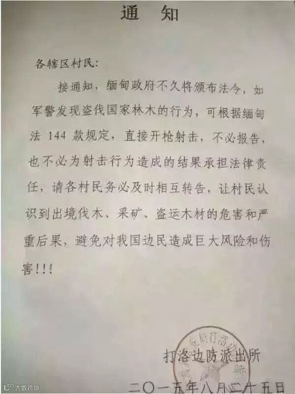 2015年8月25日,传出了“如军警发现盗伐国家林木的行为,可根据缅甸法114款规定,直接开枪射击,不必报告,也不必为射击行为造成的结果承担法律责任。”