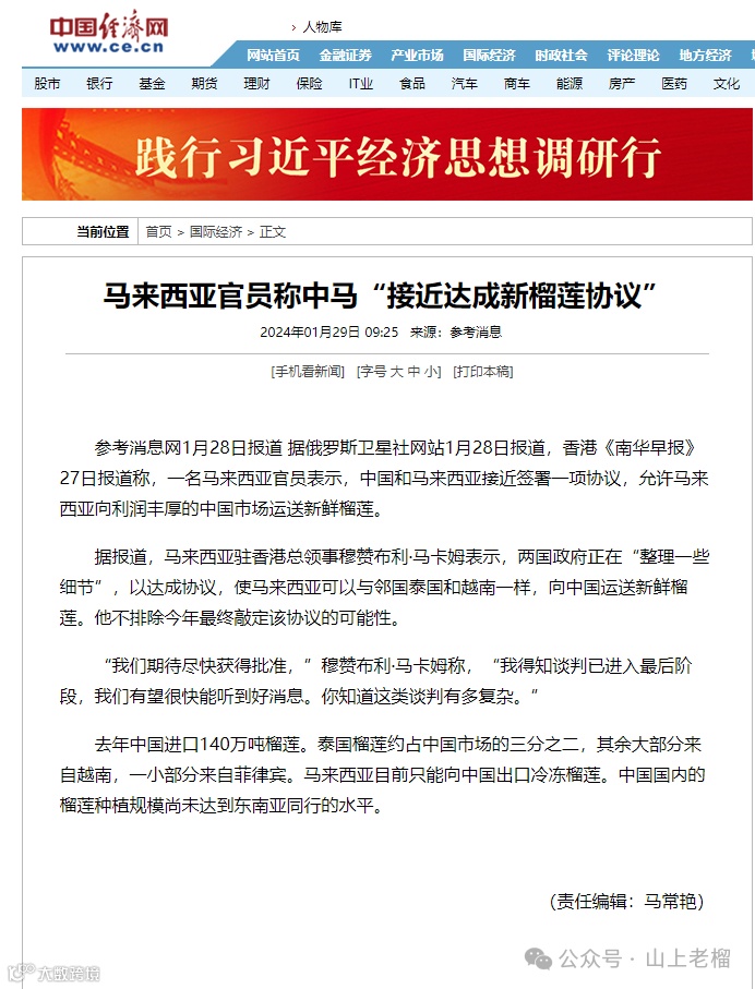 月向中国政府提交了新鲜榴莲向中国出口协议,有望今年获批,这会是榴莲市场又一大巨大风口。