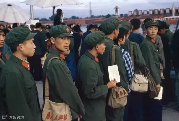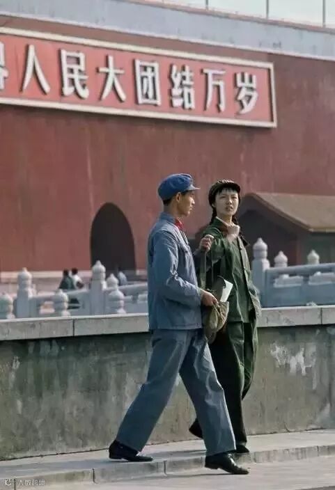 工人穿深蓝色工服,军人穿墨绿色军装,