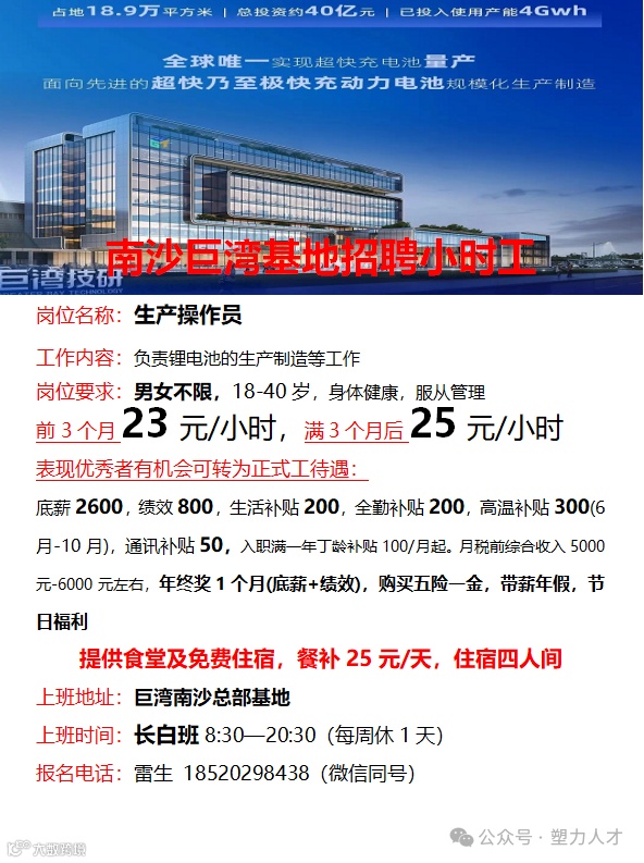 周四面试丨南沙巨湾总部基地丨长白班丨包吃包住丨男女不限丨生产操作员丨
