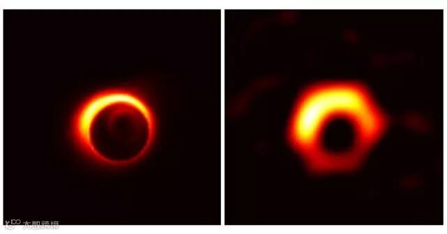 图注:这是先前由计算机模拟生成的M87星系中心黑洞两种可能的样子。