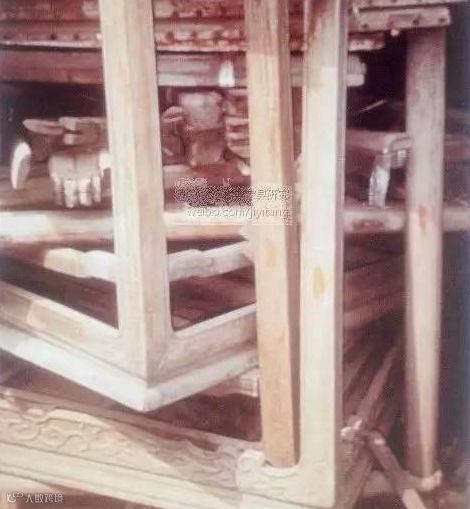 照片上还能清楚的看到,因风吹日晒泛白的家具,已经在腿上刮出内在的木质颜色,金灿灿的闪耀着,明显是黄花梨一类。