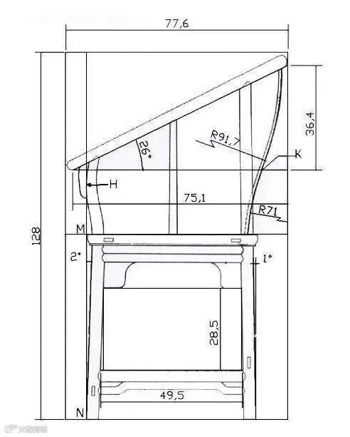 坐宽在现代人体工程学规定的尺寸为380mm,而明式座椅的坐宽大约在400mm,与其基本吻合;同样,根据我国的人体平均尺度,坐深应不大于420 mm,明式座椅的坐深为400 mm,符合这一规定。