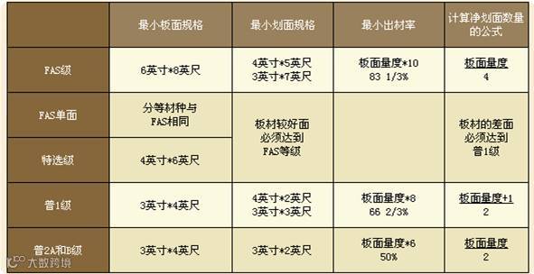 这套规则一直是北美硬木工业的标准并且成为出口板材的规则划分基础,它不是以木材本身包含树节及其它缺陷的大小或多少(外观)为唯一等级划分依据,而是依据客户产品及用料、出材率(实用)为原则,来确定每一块板材的等级。是目前国际上最完善、最科学的木材等级划分规则之一。