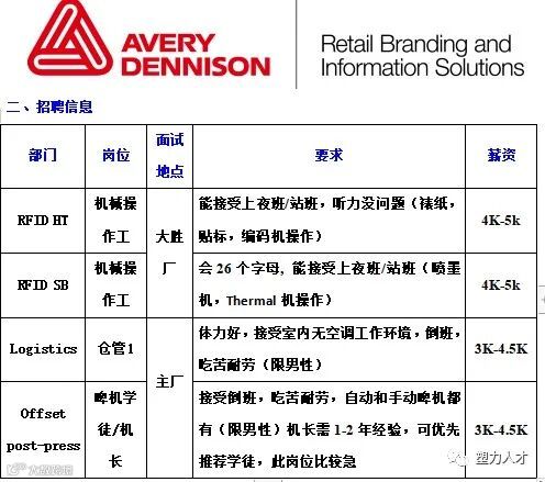 【美资-艾利(广州)包装系统产品有限公司】4000-5000元/月/10月7号(今日)面试/五险一金/免费工作餐/五天八小时 塑力人才