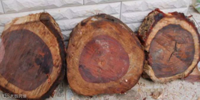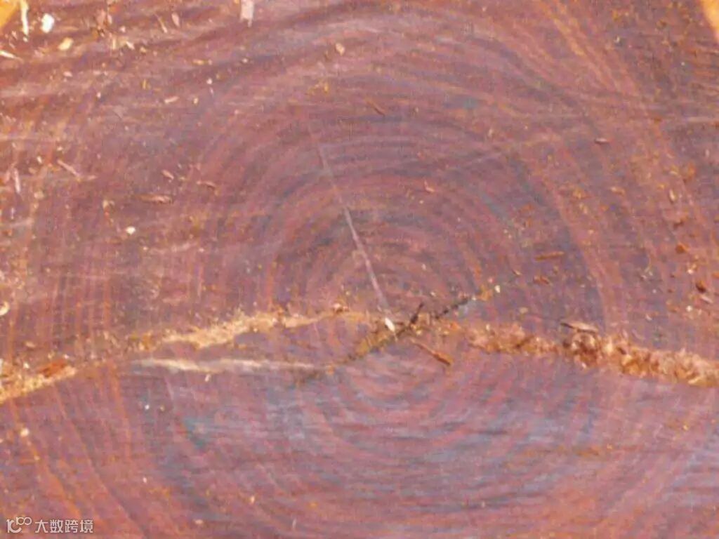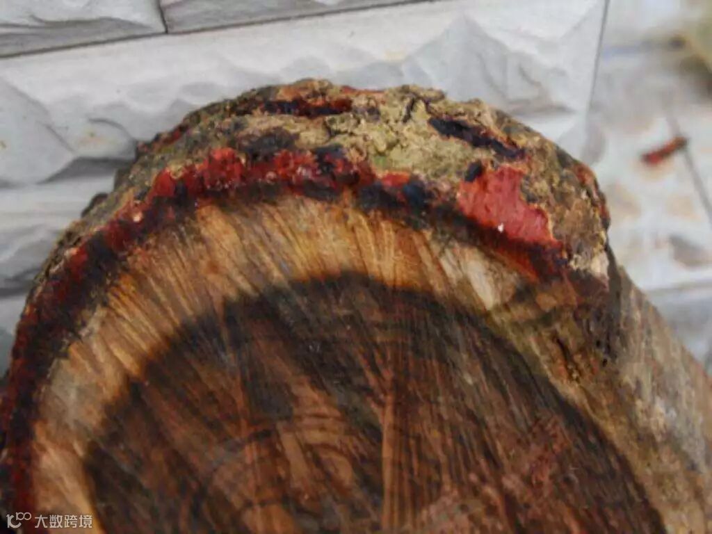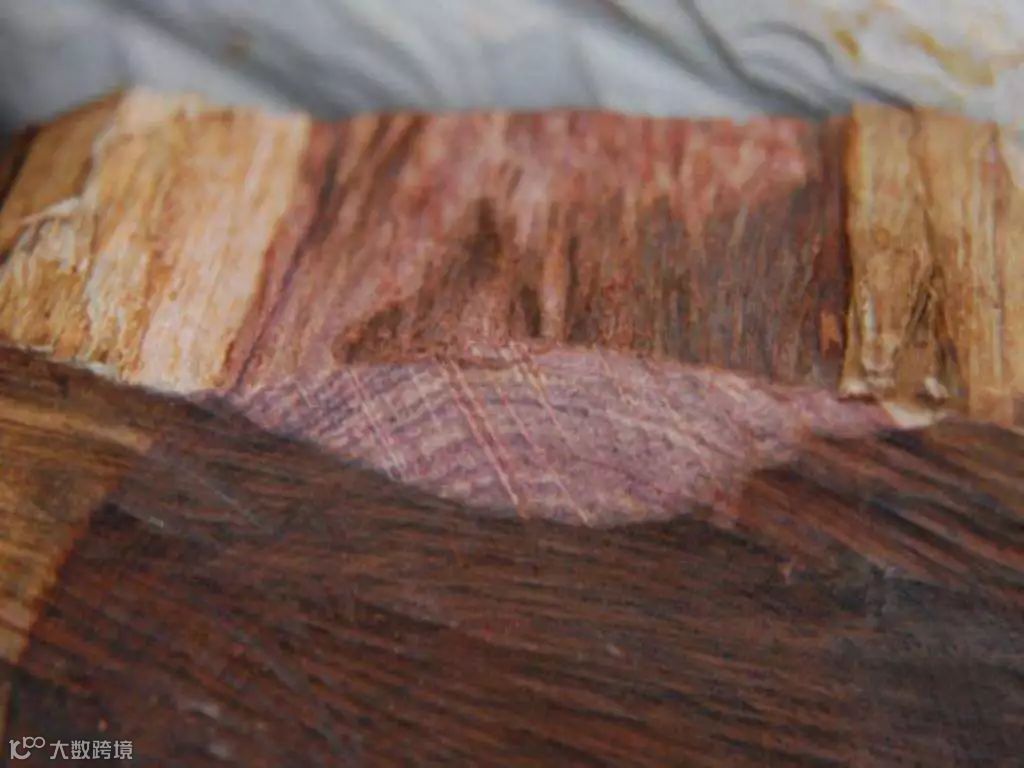 局部系拍照时用斧头砍成弦切面,以观察材质结构。很明显,这是新料,而且是嫩料,底色不够深,黑筋也不够粗不够黑。但跟花枝木一比较,就看出大红酸枝的底色完全不一样了。清洗之后2小时,红枝的酸香气依然浓郁,且完全不刺鼻,味道很纯正。