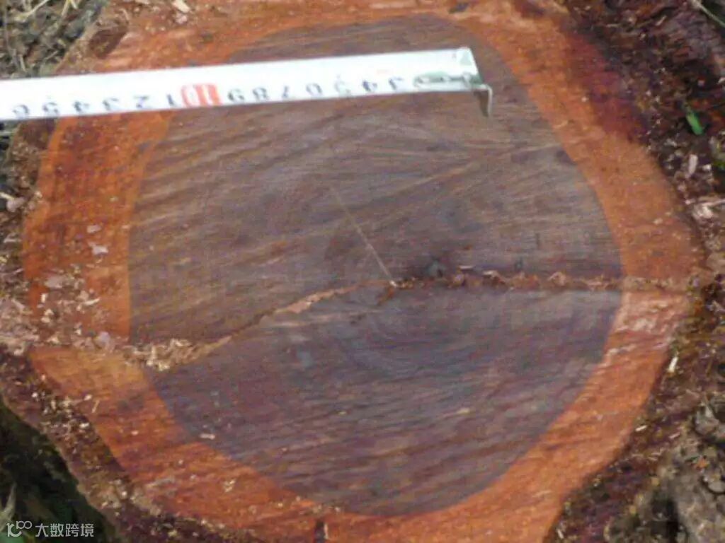 由于路途遥远,全靠步行爬山,采集者未能到达可砍伐大料的森林,而是在进去的半途中,任意找了三棵树砍伐取样。其中大红酸枝(交趾黄檀)2棵、花枝(巴里黄檀)1棵。而这样大小的树很多,均为林场砍伐过程中判定为尺寸规格不合大料要求而不砍伐的。