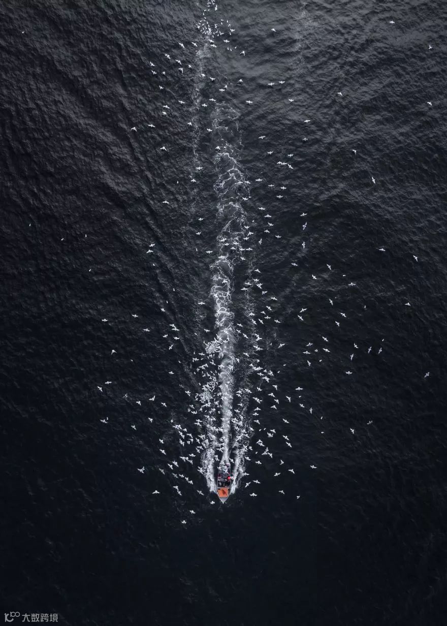 一个艘渔船引得一群海鸥追随