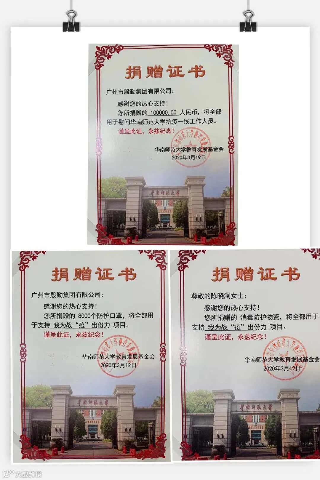 此外,殷勤集团捐赠华南师范大学人民币十万元,作为“我为战疫出份力”专项募捐的款项,“我为战疫出份力”专项募捐项目是华南师范大学校友总会、教育发展基金会发起的一个专项募捐款,主要是为了筹集善款物资,支援疫情防控阻击战。